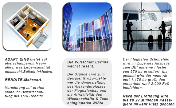 Adapt Apartments sind EIN- oder ZWEI- Zimmer Apartments mit Balkon die im 4-Sterne Standard möbliert sind. Dieses sehr innovatives Service-Konzept wird vom Schweizer Marktführer im Bereich "möbiliertes Wohnen", der Vision AG betrieben. Der Vorteil gegenüber normalen Immobilen-Investments: Sie erhalten Sie nicht nur die garantierte Basis-Miete Ihres Apartments in Höhe von 11,-€, sondern sind auch anteilig an allen Umsätzen des Service-Konzepts beteiligt, wie z.B: zusätzlicher Wäscheservice, Pay-TV, Shops und vielen weiteren kostenpflichtigen Leistungen, die vom Mieter genutzt werden. Somit ist bei optimaler Auslastung eine Eigenkapital-Rendite von 15% p.a. zu erzielen.