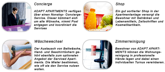 ADAPT APARTMENTS setzen auf ein umfangreiches Service-Angebot, das den Mietern das Leben erleichtert, ihnen lästige Arbeiten abnimmt. Die Services steigern die Attraktivität der ADAPT APARTMENTS zur Perfektion.